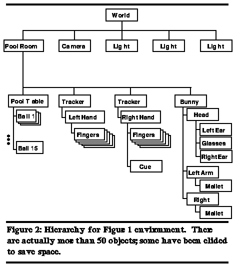 ftp://ftp.cwi.nl or http://www.cwi.nl/~guido/Python.html.Alice provides a set of Python classes for creating and manipulating geometric objects in three-dimensional environments. Alice models the world as a hierarchical collection of objects; Figure 2 shows the hierarchy of objects in the scene from Figure 1. By default, an objects moves in its parent's coordinate system: a billiards ball, for example, specifies its position relative to the billiards table. If the billiards table is moved within the room, all the balls will move with it. The parent/child relationships in the hierarchy can be reorganized on-the-fly. To have the cue ball hop off the table and onto the floor, one could type